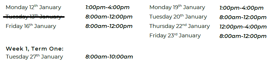 Regular trading hours from Week 2, Term 1 onwards are as follows: