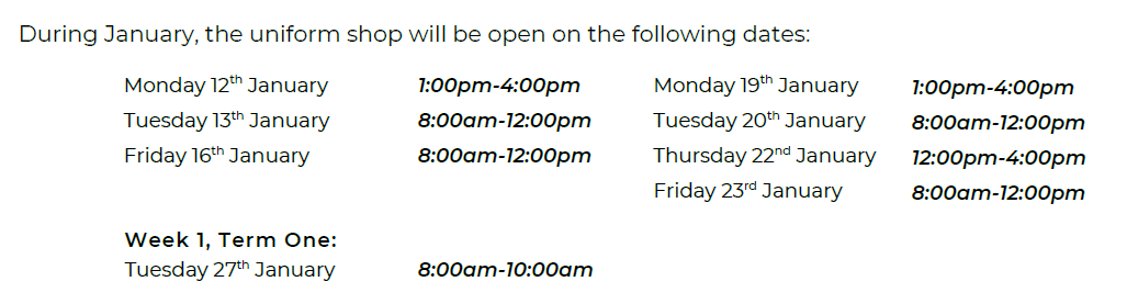 During January 2026, the uniform shop will be open on the following dates: